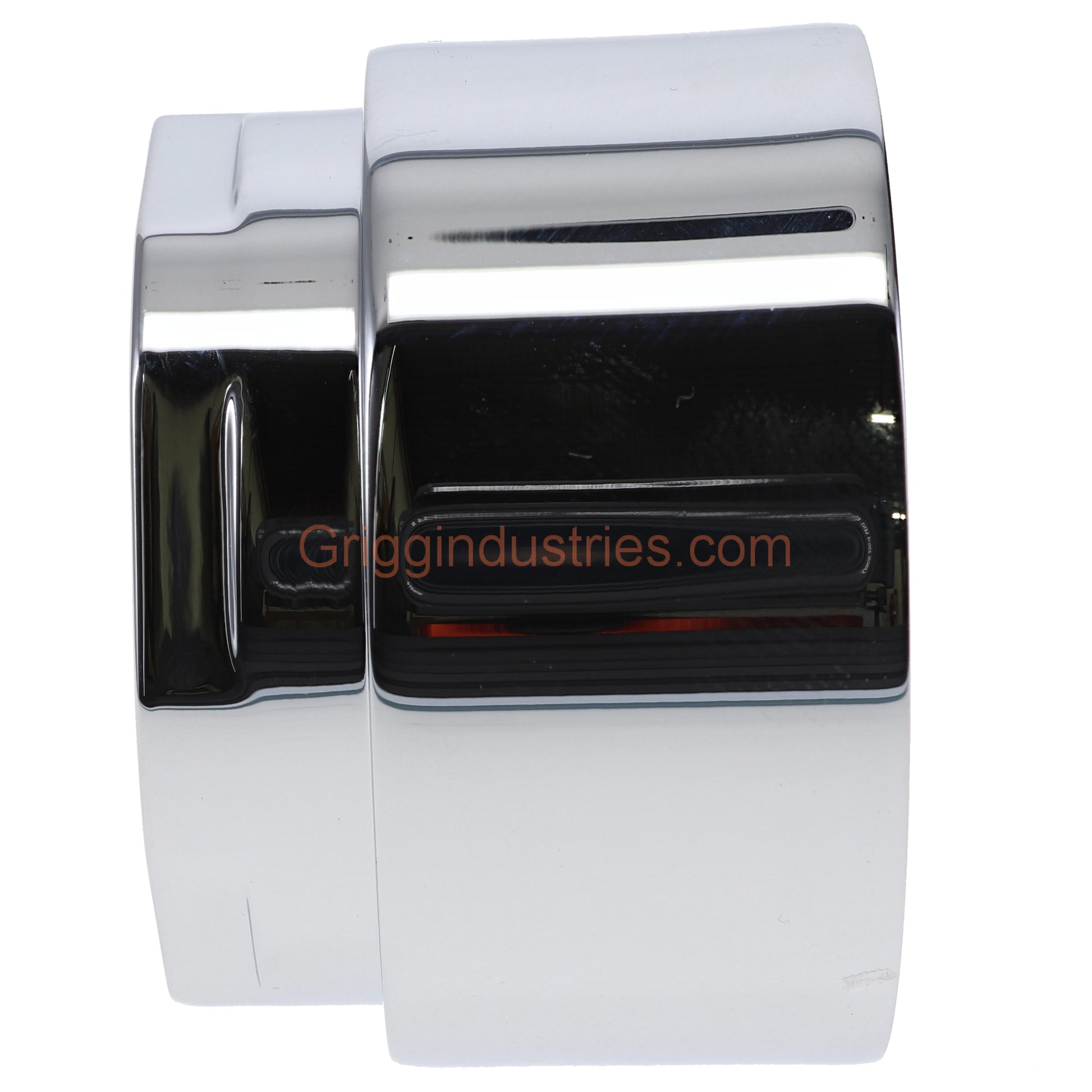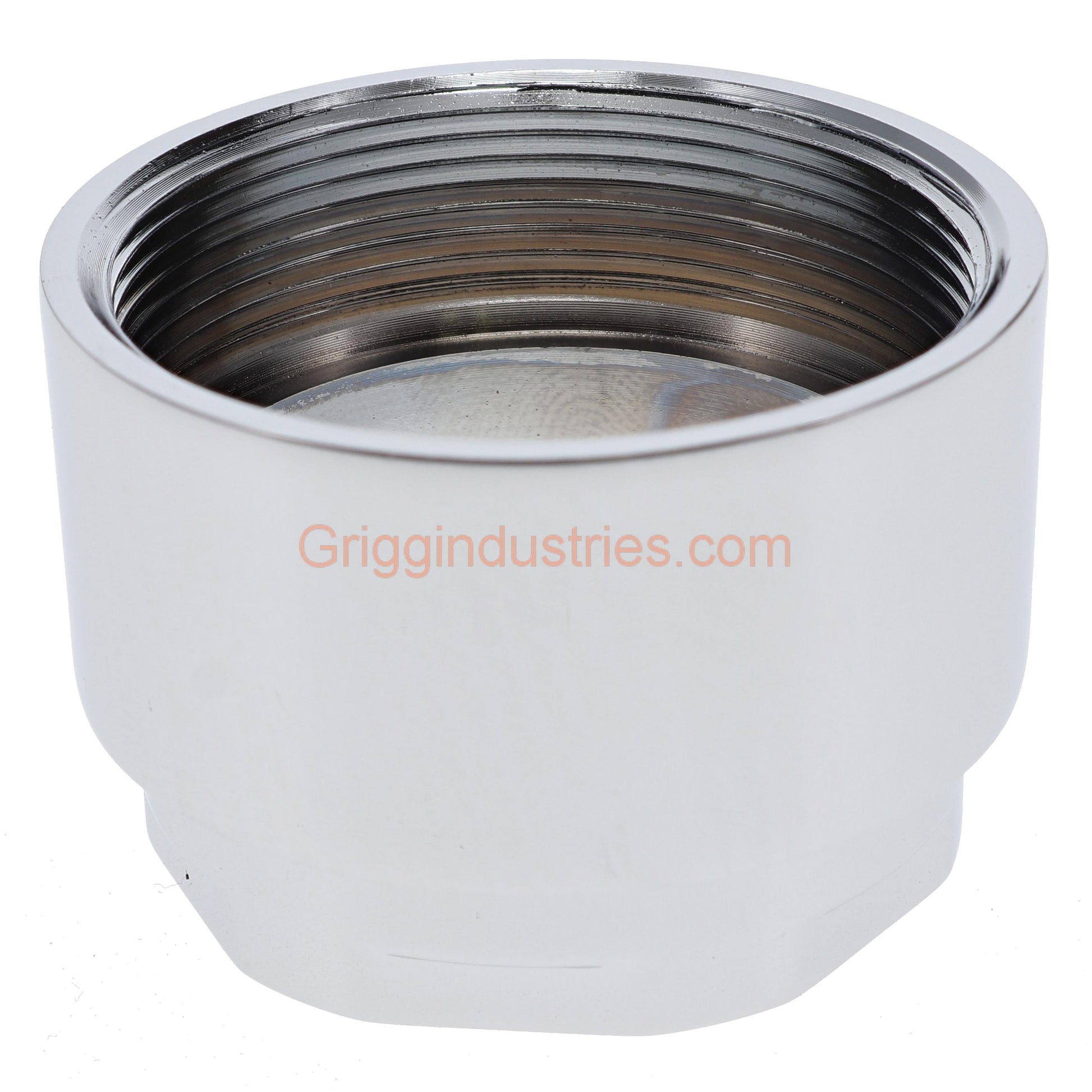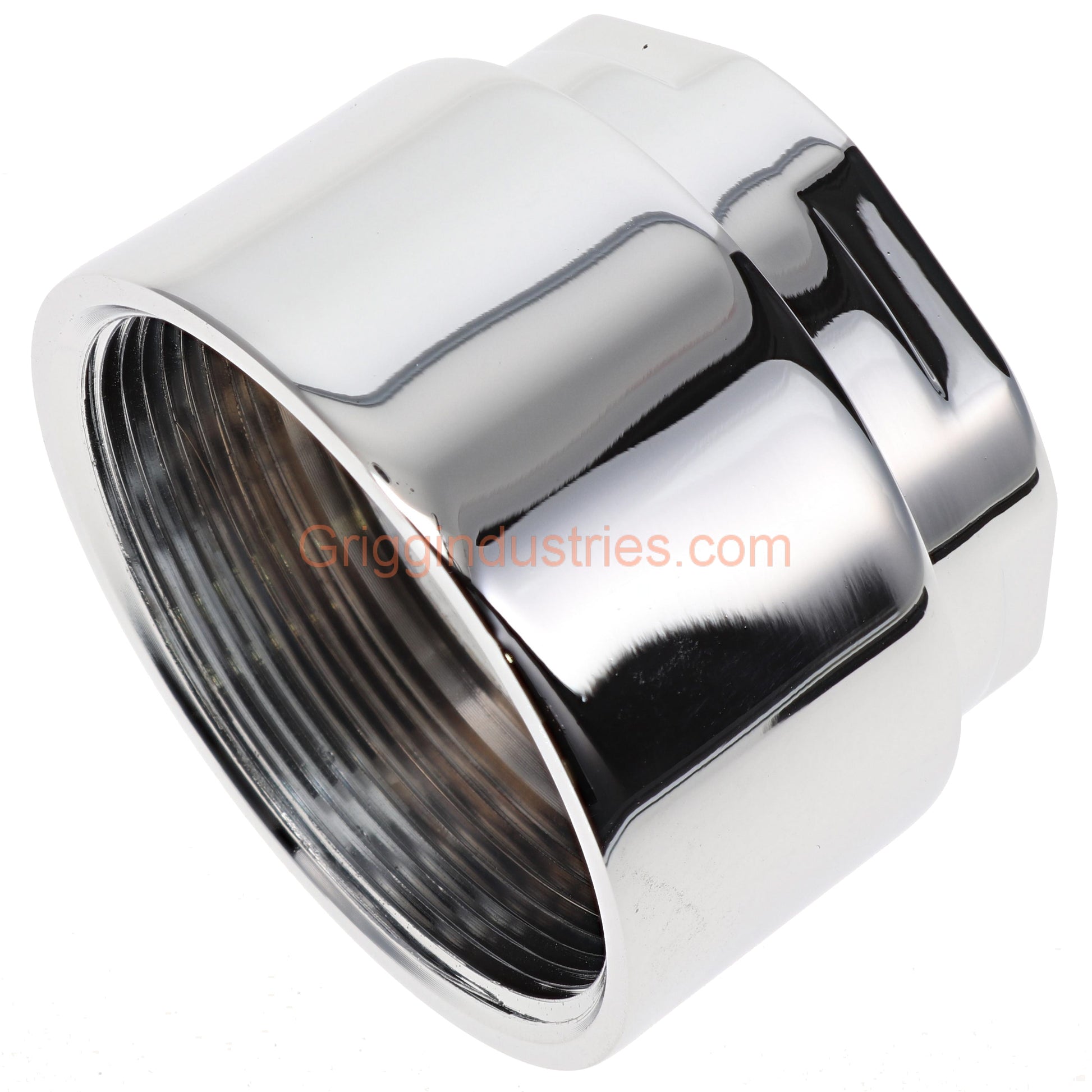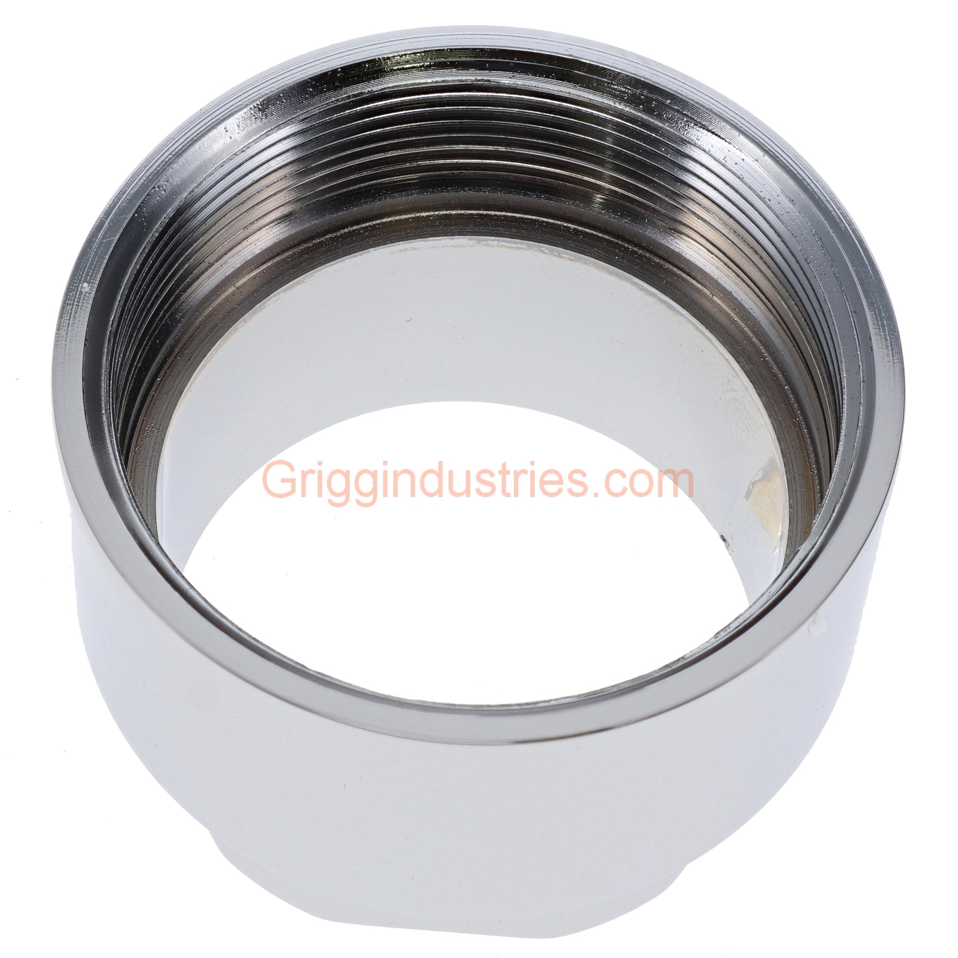 Gerber A103020CP retainer nut. This nut is in chrome. It is used to help hold the cartridge in. The larger end of the retainer net has a set of internal thread that allow the nut to thread into the valve around the cartridge. The outer diameter at the threaded end measures approximately 1 3/4 inches. The outer diameter at the smaller end is roughly 1 1/2 inches.