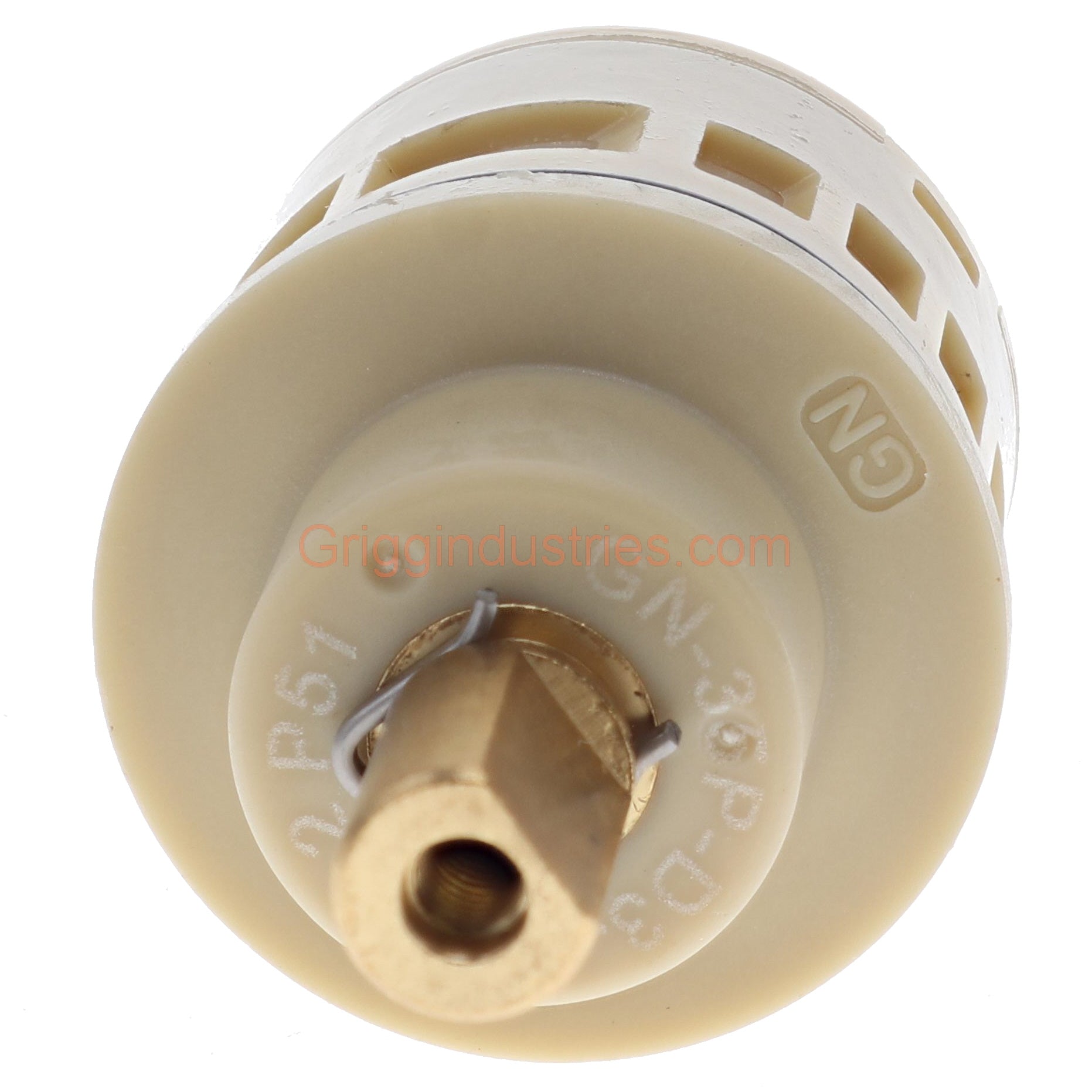 Gerber A510039 cartridge for diverter valve. The A510039 is designed for several Gerber shower valves. The total length of the cartridge measures approximately 2 inches from the base to the end of the brass stem. The outer diameter at the base of the cartridge is roughly 1 1/4 inches.