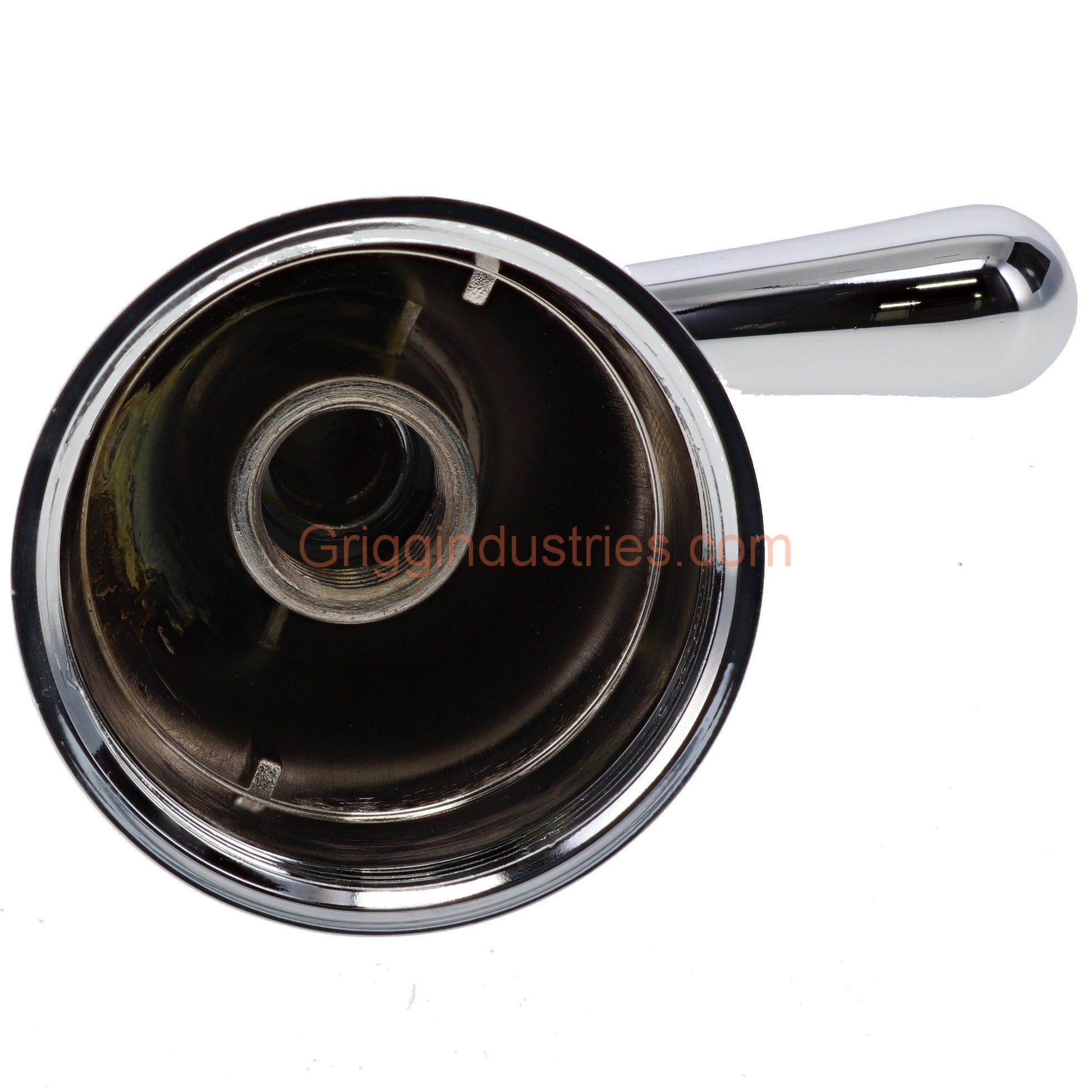 Gerber A602607CP Metal handle in a chrome finish. This handle has female threads on the base to secure it to the faucet, and threads on the broach below where the cartridge would connect to the handle.
