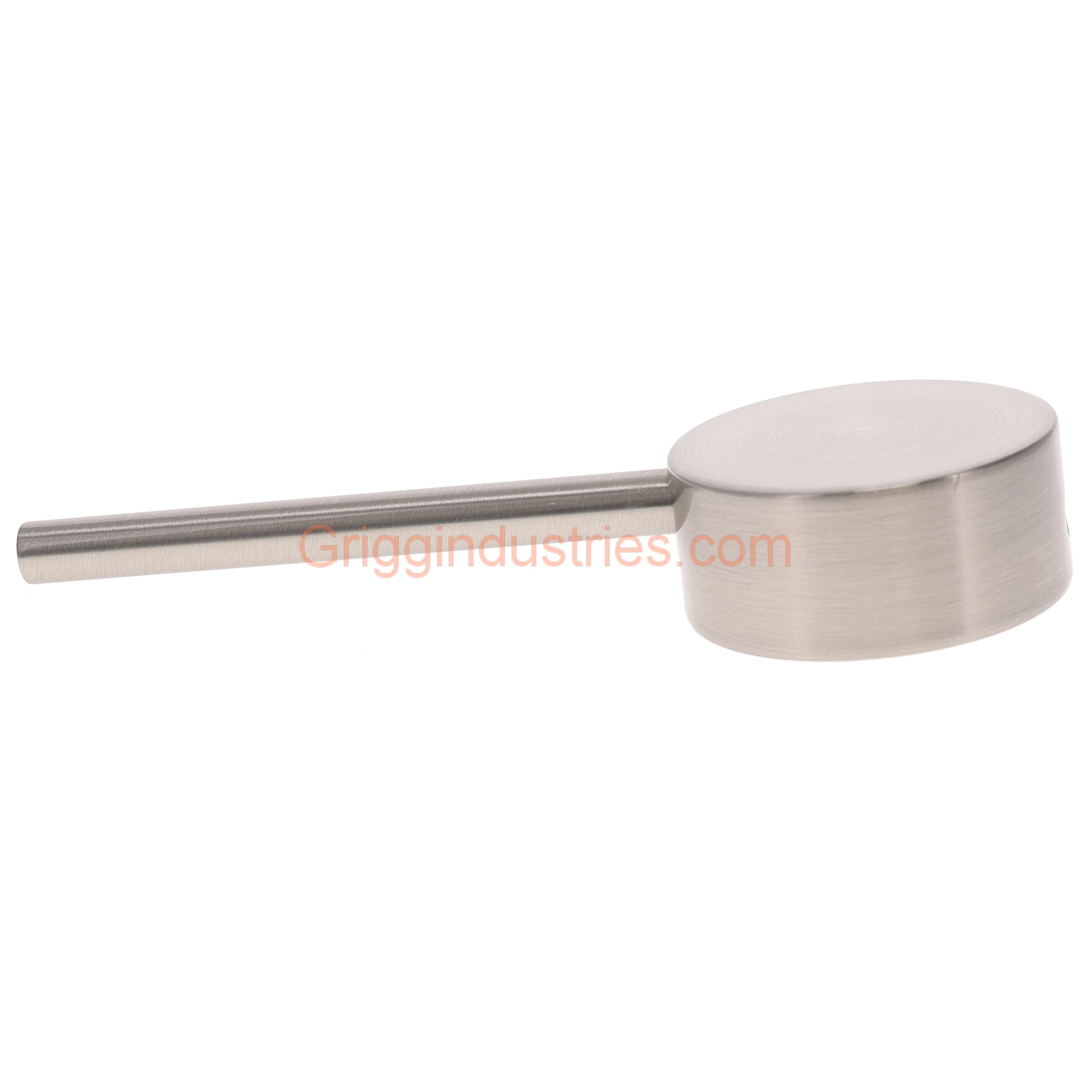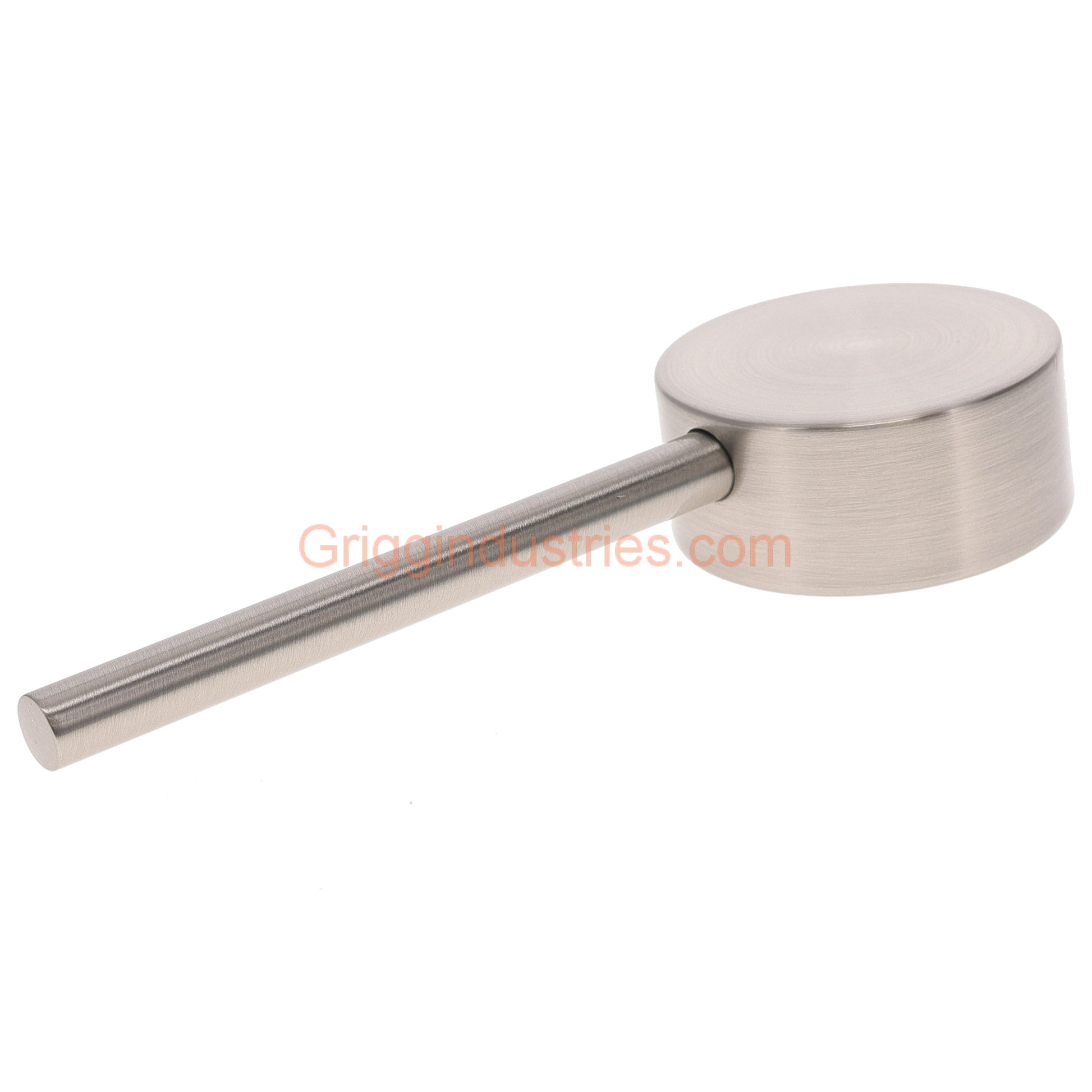 This replacement faucet handle comes in a brushed nickel finish