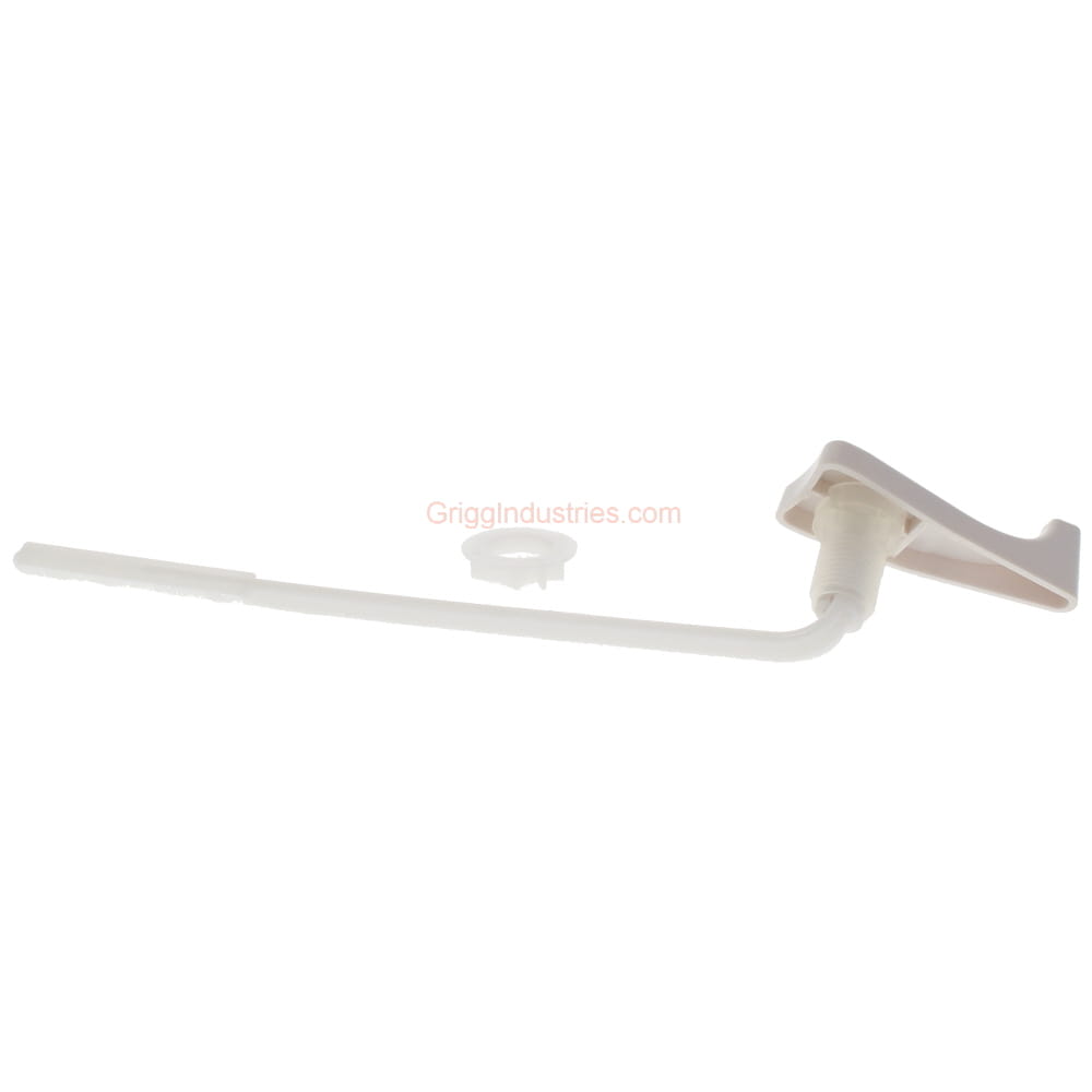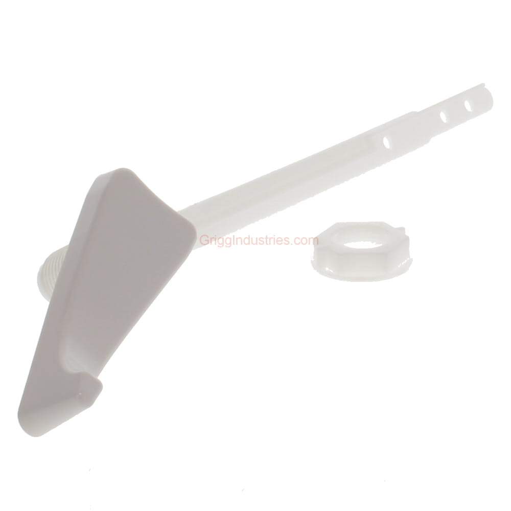 Genuine Crane 7381198-200.0200A trip lever in white finish for Crane Galaxy toilets. This lever is for the left hand side of the toilet. It does come with the nut to hold it onto the tank. The nut will be reverse thread.