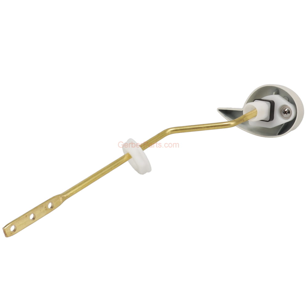 Genuine Gerber 99-659-09 biscuit color trip lever. This lever comes with the nut to hold it onto the tank. Other parts numbers are G009965909, 009965909, 9965909. The arm of this lever is metal and has the holes to connect the flapper hook.