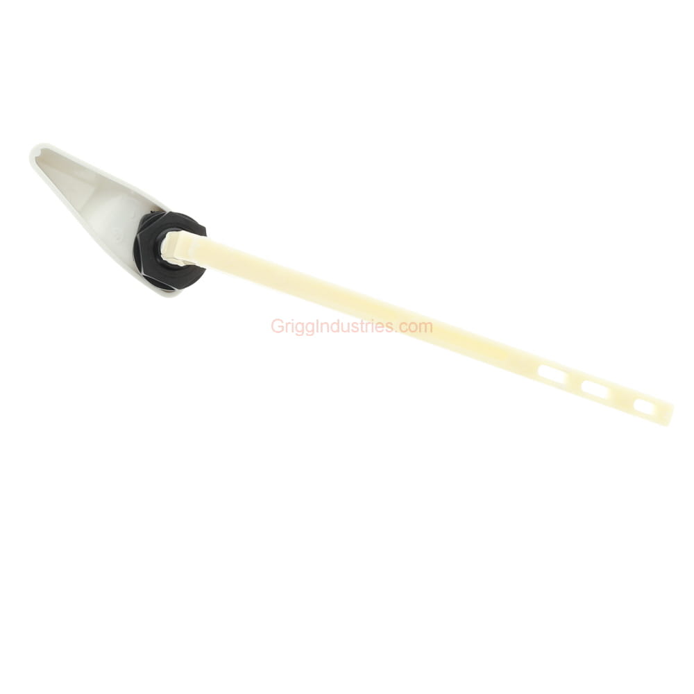 White Trip Lever For Several Mansfield Tanks Including 11, 21, 26, 160, 161, 165, 170, 171, 175, 180, and 190. This lever is shorter than most it has a 7 inch arm. The holes in the lever have been added some of the original levers did not have holes in them but this is the replacement for them. If your lever is breaking, or if it is hard to flush you probably need to replace the flush valve seal. A new seal usually makes the toilet flush with one finger.